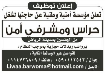 اليوم السبت التقديم على وظائف حراسات أمنية الرياض وظائف